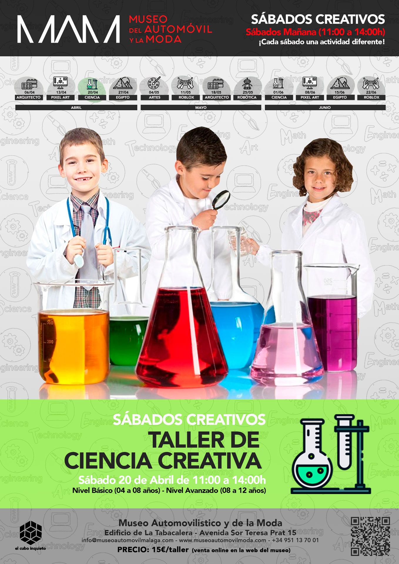 El Museo del Automóvil y la Moda de Málaga ha preparado en colaboración con El Cubo Inquieto un campamento infantil de Semana Santa para que los más pequeños disfruten al máximo de las vacaciones a la vez que aprenden sobre ciencia y tecnología. Todos los talleres están dirigidos a niños y niñas de 4 a 12 años. Cada día, en horario de 10 a 14 horas, […]