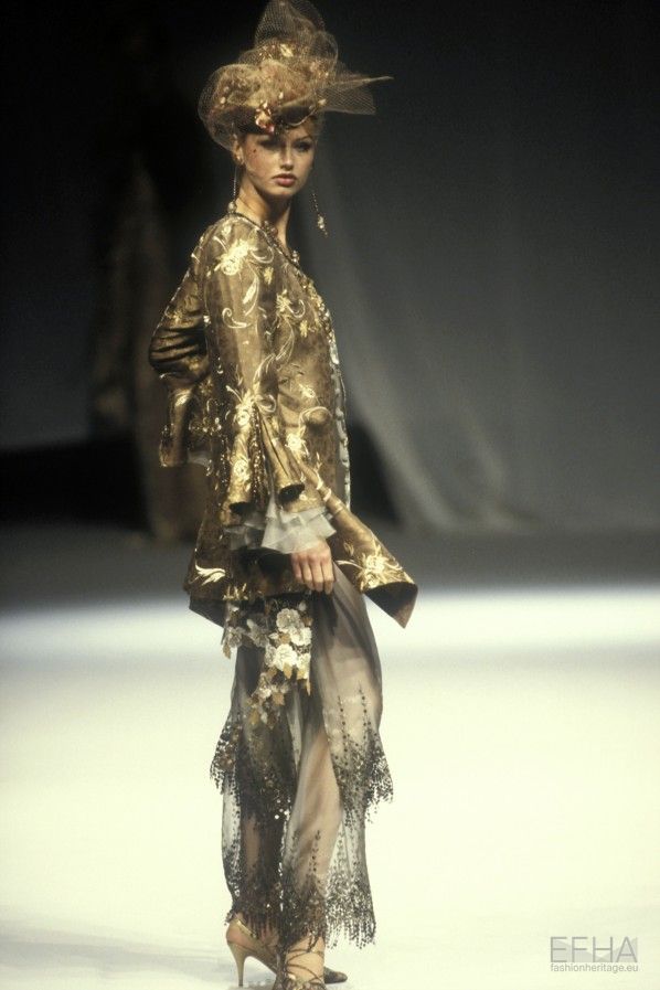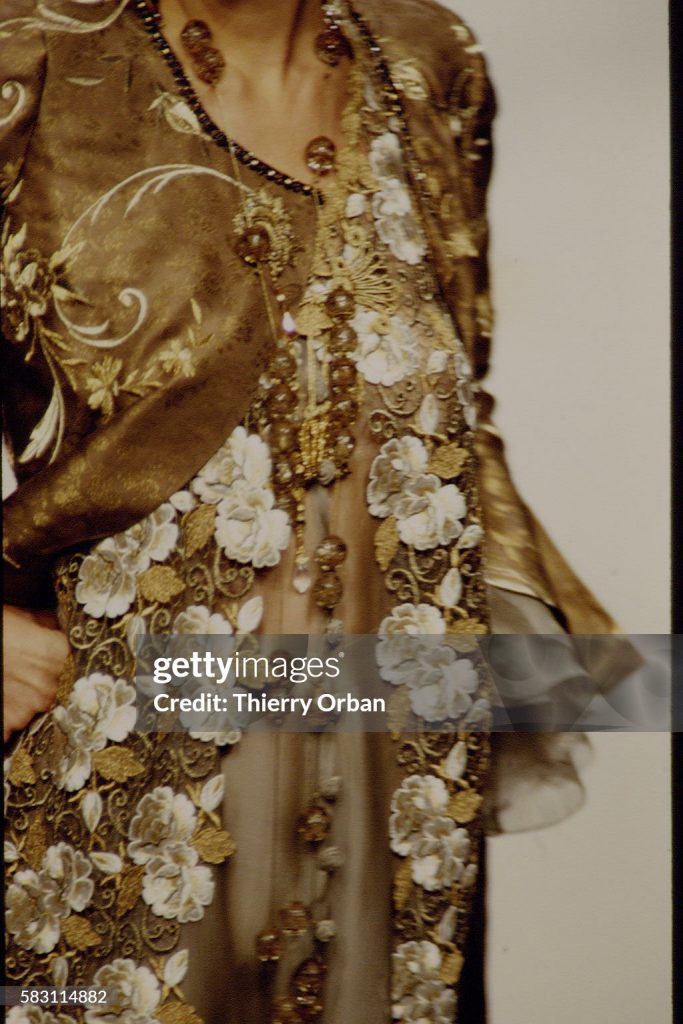 El conjunto de Alta Costura Primavera–Verano de 1995 que hoy destacamos encarna a la perfección esta filosofía. La superposición de tejidos y texturas crea un delicado juego de transparencias que aporta un guiño sutilmente sensual, mientras que los motivos florales y las siluetas sueltas evocan una feminidad abierta, sugerente y deliberadamente ambigua. No impone una lectura única, sino que invita al espectador a interpretarla.